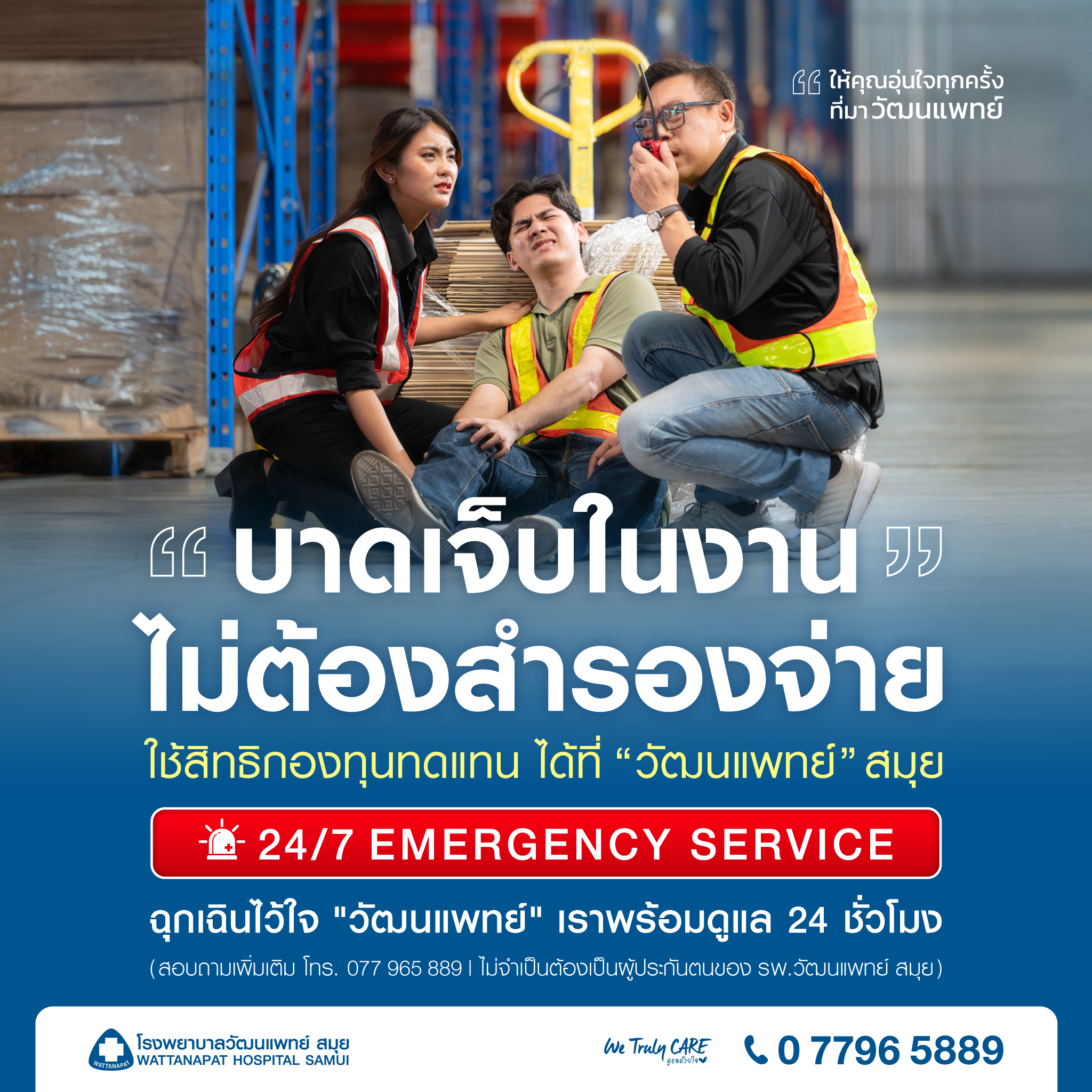หากคุณหรือเพื่อนร่วมงานประสบอันตรายจากการทำงาน โรงพยาบาลวัฒนแพทย์สมุยยินดีให้บริการตรวจรักษาครบวงจร ด้วยทีมแพทย์เฉพาะทางและระบบประสานงานกับสำนักงานประกันสังคมอย่างมืออาชีพ
