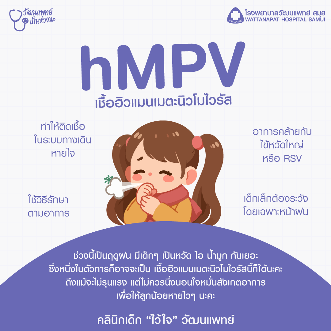 ช่วงฤดูฝนและฤดูหนาว ซึ่งเด็กๆ มักเป็นหวัดและติดเชื้อทางเดินหายใจได้บ่อย โดยไวรัส hMPV แพร่กระจายผ่านทางการสัมผัสสารคัดหลั่งจากผู้ติดเชื้อ เช่น การไอหรือจาม การสัมผัสกับพื้นผิวที่ปนเปื้อนเชื้อแล้วสัมผัสหน้าหรือจมูก ทำให้ไวรัสเข้าสู่ร่างกาย